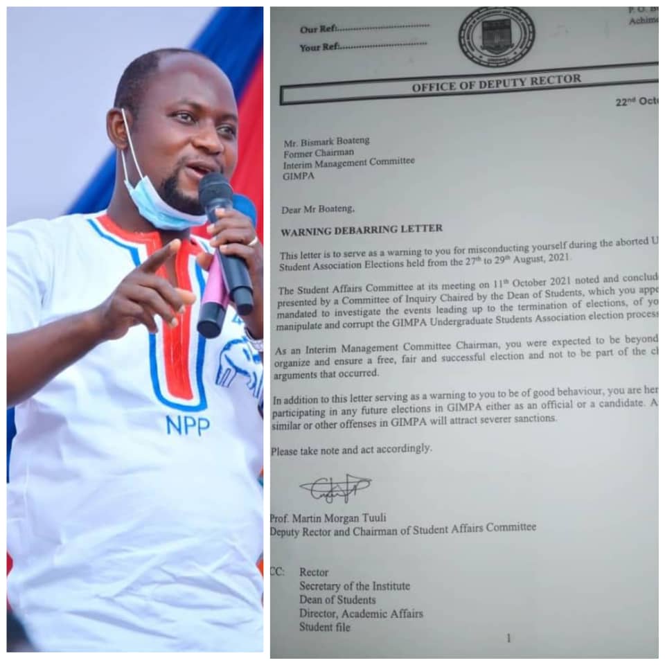 The New Patrotic Party(NPP) Ayawaso Central constituency Chairman, Bismack Boateng, has been debarred by management of the Ghana Institute of Management and Public Administration(GIMPA) from participating in future students elections either as an official or candidate.