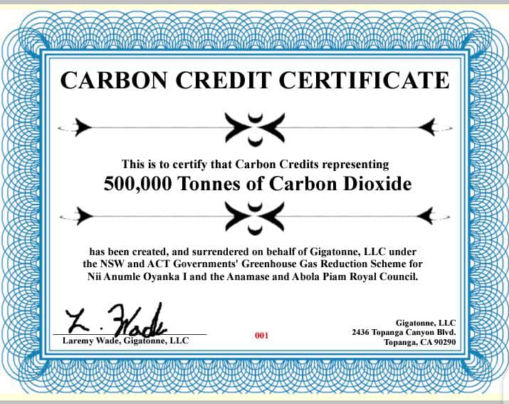 The Royal council represented by King Oyanka and His Royal financial director Nii Adama Djata have signed a deal with the VP of Enercor and Vanguard Energy (the second largest company in the world) and they have given signed authority to the carbon credits from 1 of 10 oil leases located in Utah, USA that is equal to half a billion barrels of oil sands carbon credits. The oil carbon credits were offered tocreate a coin backed by each credit certificate. Exxon owns 8% of this project which is where the geology reports originated and also the head of the EPA (Environmental protection agency) is on the board. They have not been registered so we have to sell them at minimum price, but that is still Millions of dollars of Carbon Credits given from Exxon and we have the president as registered agent to Gigatonne LLC to verify.