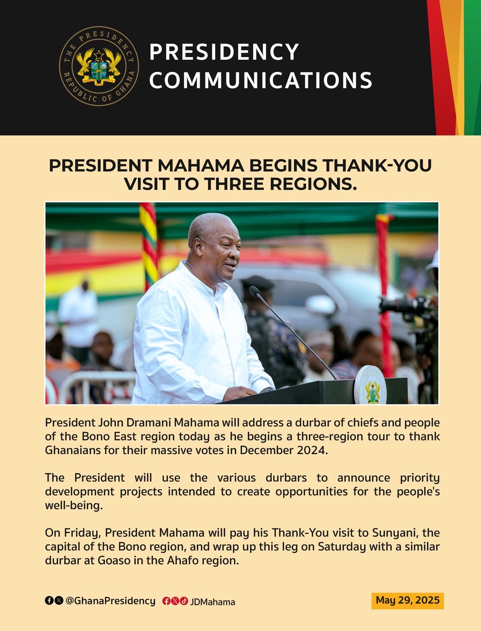 President John Dramani Mahama has launched a nationwide “Thank You” tour, kicking off in the Bono East Region.