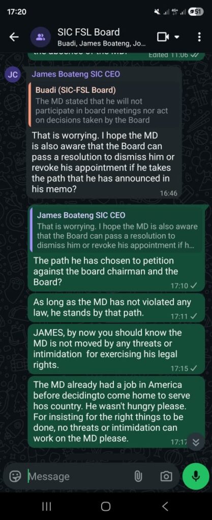 In a trending WhatsApp chat picked by our news team, there seems to be a headed conversation between the MD and the board members with the Managing Director insisting he is not moved by any intimidation or threats for doing the right thing.